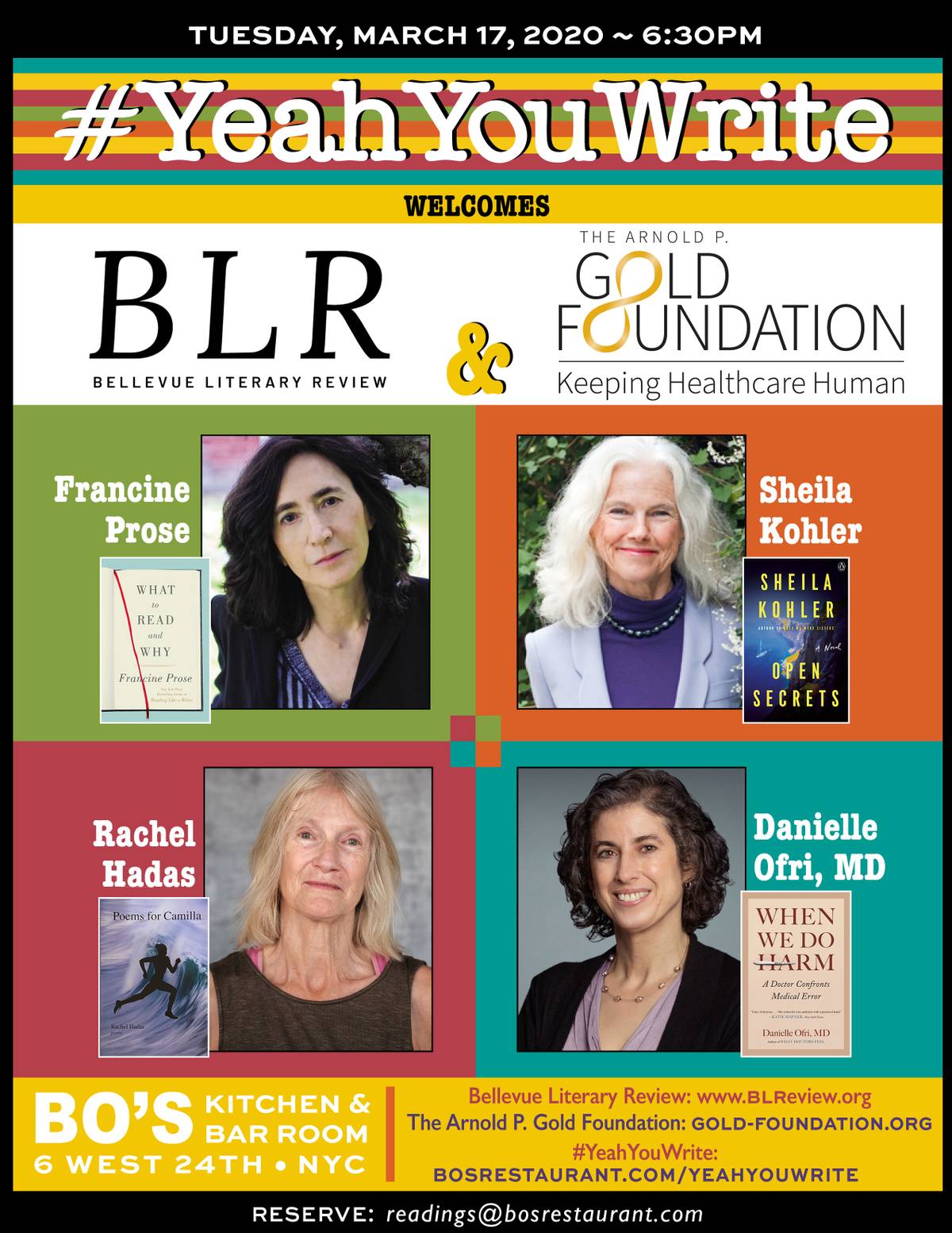 Flyer for YeahYouWrite event at Bo’s restaurant in NYC on March 17 with Bellevue Literary Review