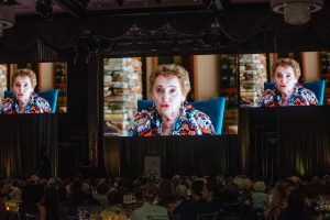 Elaine Adler, speaking on screen at the 2019 Golden Thread Gala