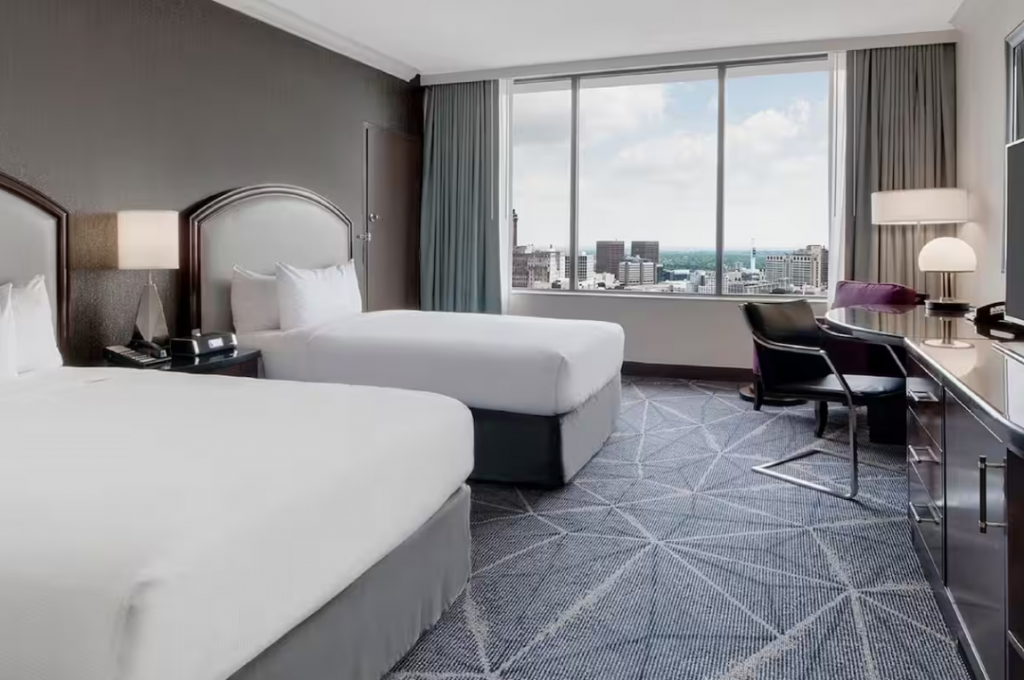 Located in downtown Atlanta, the Hilton Atlanta is within walking distance of several local attractions, including the Georgia Aquarium, the State Farm Arena, and the Mercedes-Benz Stadium. It is located 15 minutes away from Hartsfield-Jackson Atlanta International Airport.